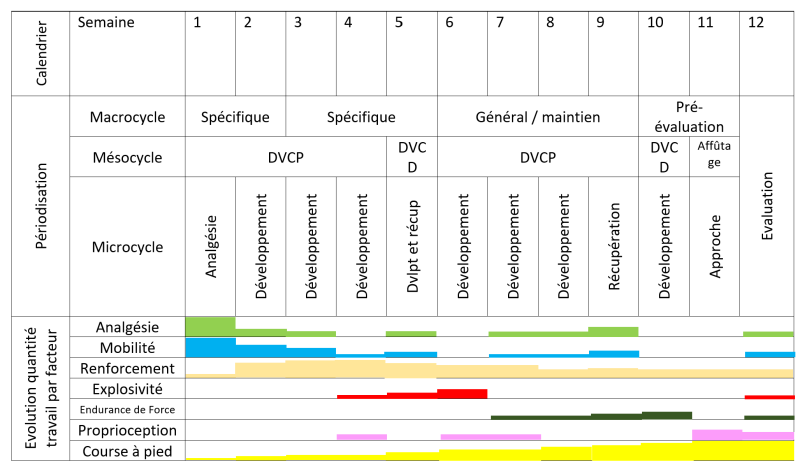 Voici un tableau récapitulant la progression des exercices par genre ainsi que celle de la course à pied. Ce programme compile tous les exercices que j'ai pu donner au cabinet, en fonction des différents déficits constatés, afin d'être certain d'agir sur les bons paramètres.